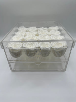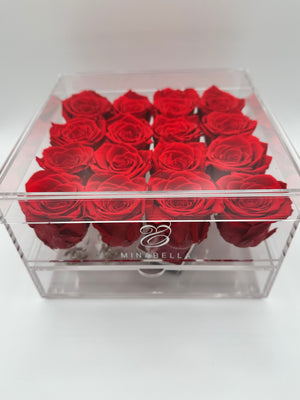 16 Preserved Roses, each thoughtfully encased within a pristine clear acrylic case with a storage drawer.