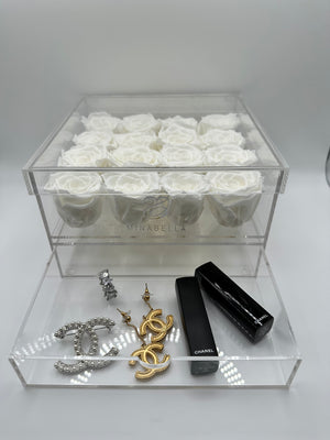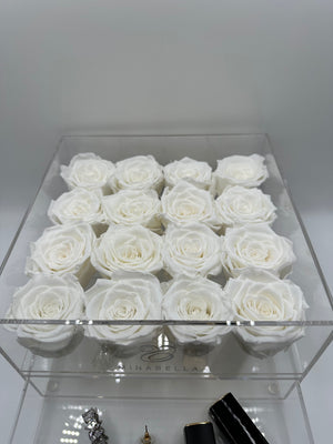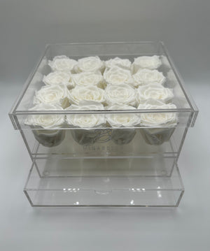 16 Preserved Roses, each thoughtfully encased within a pristine clear acrylic case with a storage drawer.