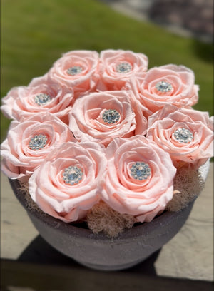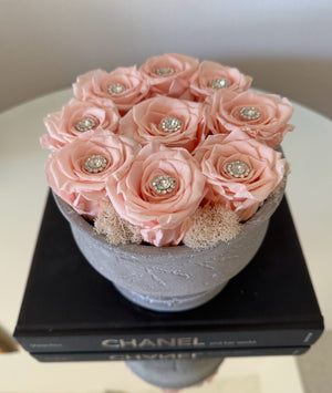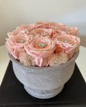 Elevate at your space with a stunning display of 9 exquisite preserved baby pink roses, elegantly arranged within a graceful footed pot. This timeless arrangement of roses is designed to last for over 3 years.