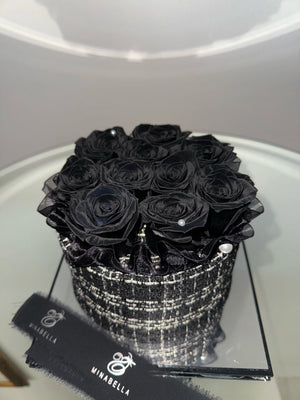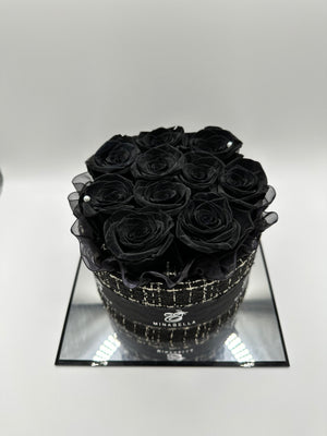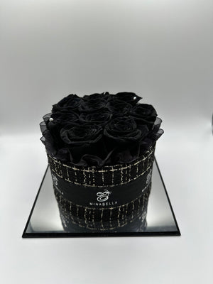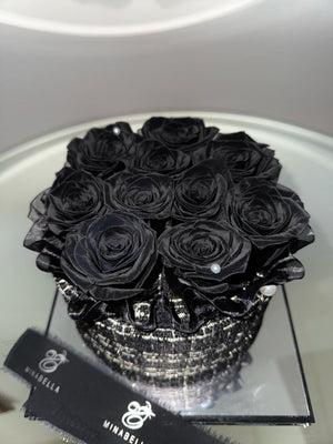 A stunning arrangement featuring ten meticulously preserved Black Roses elegantly showcased within a sophisticated acrylic statement box.