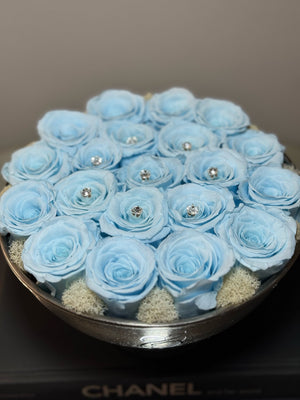 Explore our exquisite arrangement featuring 20 blue roses adorned with dazzling rhinestones at their heart. These roses will grace your space for a remarkable three years without the need for any maintenance.