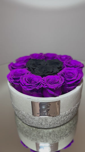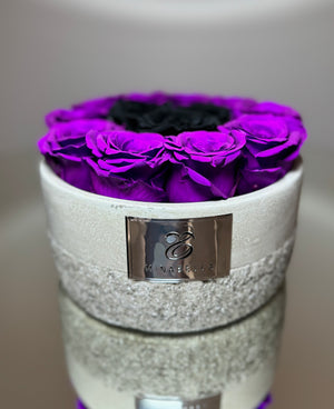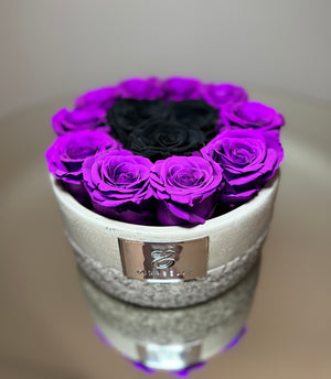 Introducing our captivating blend of deep purple and black preserved roses, perfectly nestled in a sleek, round ceramic vase. This arrangement features 13 exquisitely preserved roses that exude luxury, mystery, and timeless elegance. Whether you're celebrating the Halloween season or simply love a dramatic touch, this arrangement is the epitome of elegance and sophistication.
