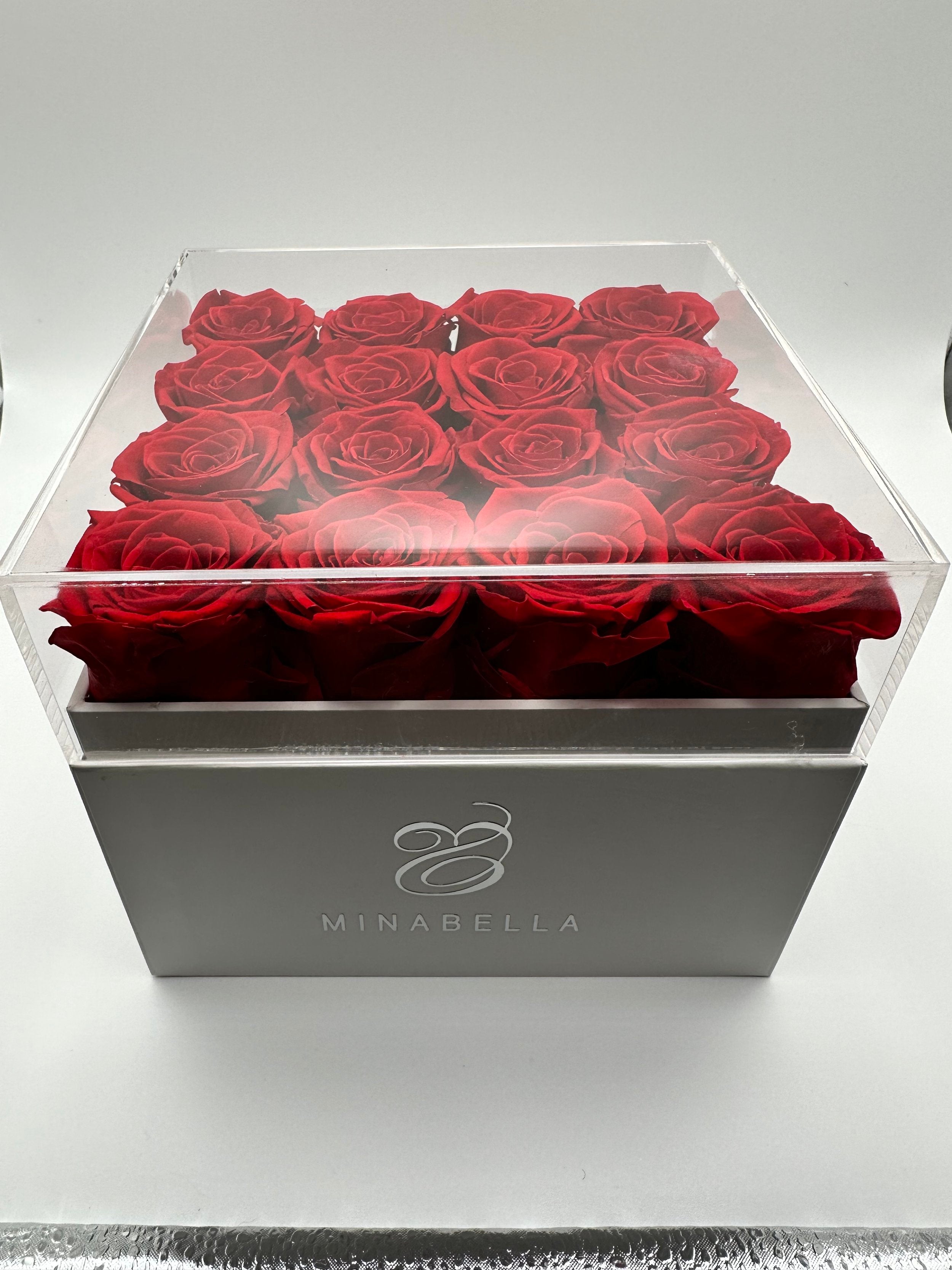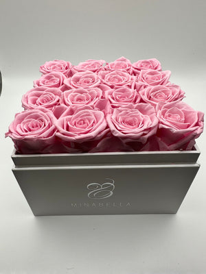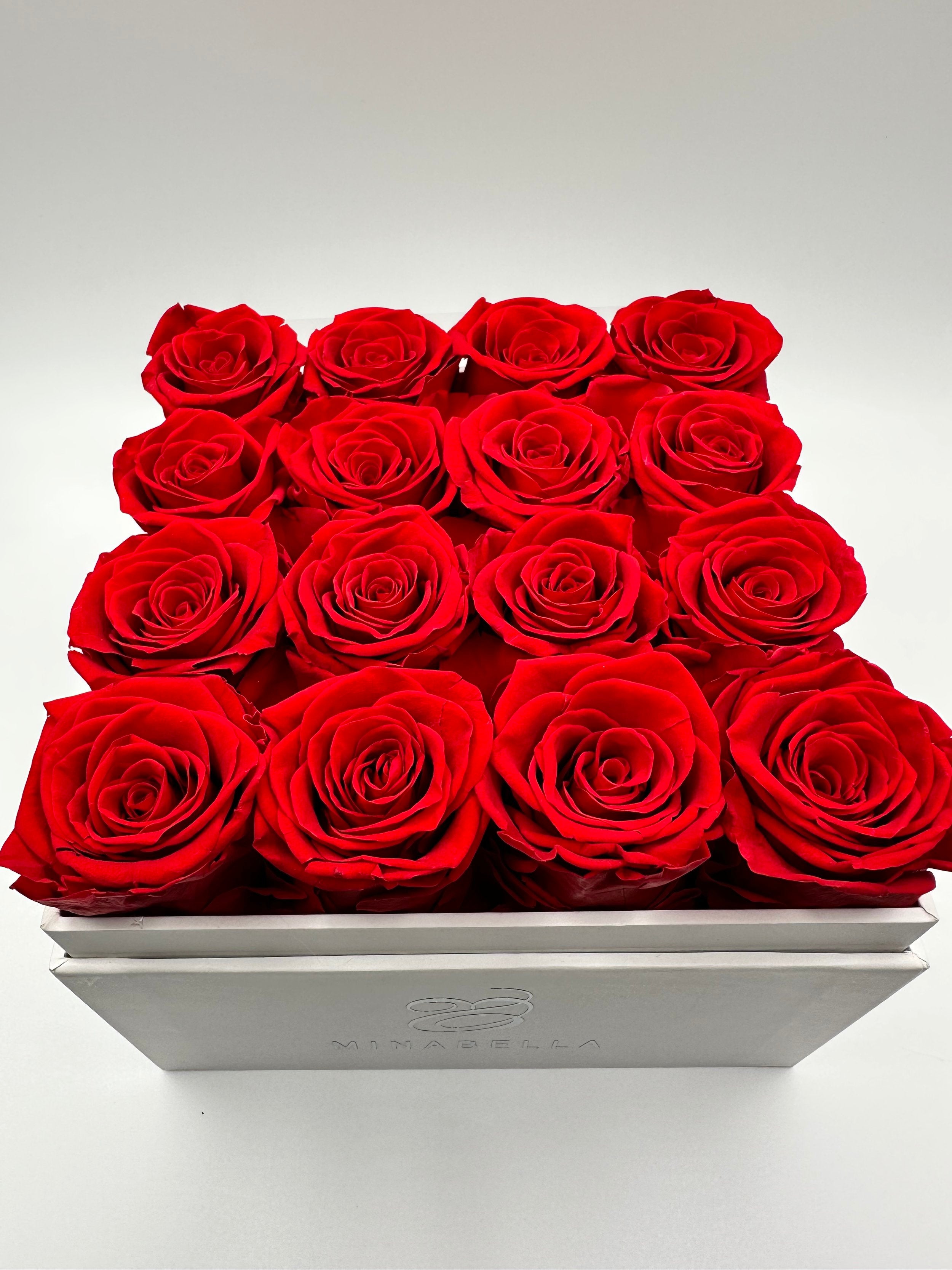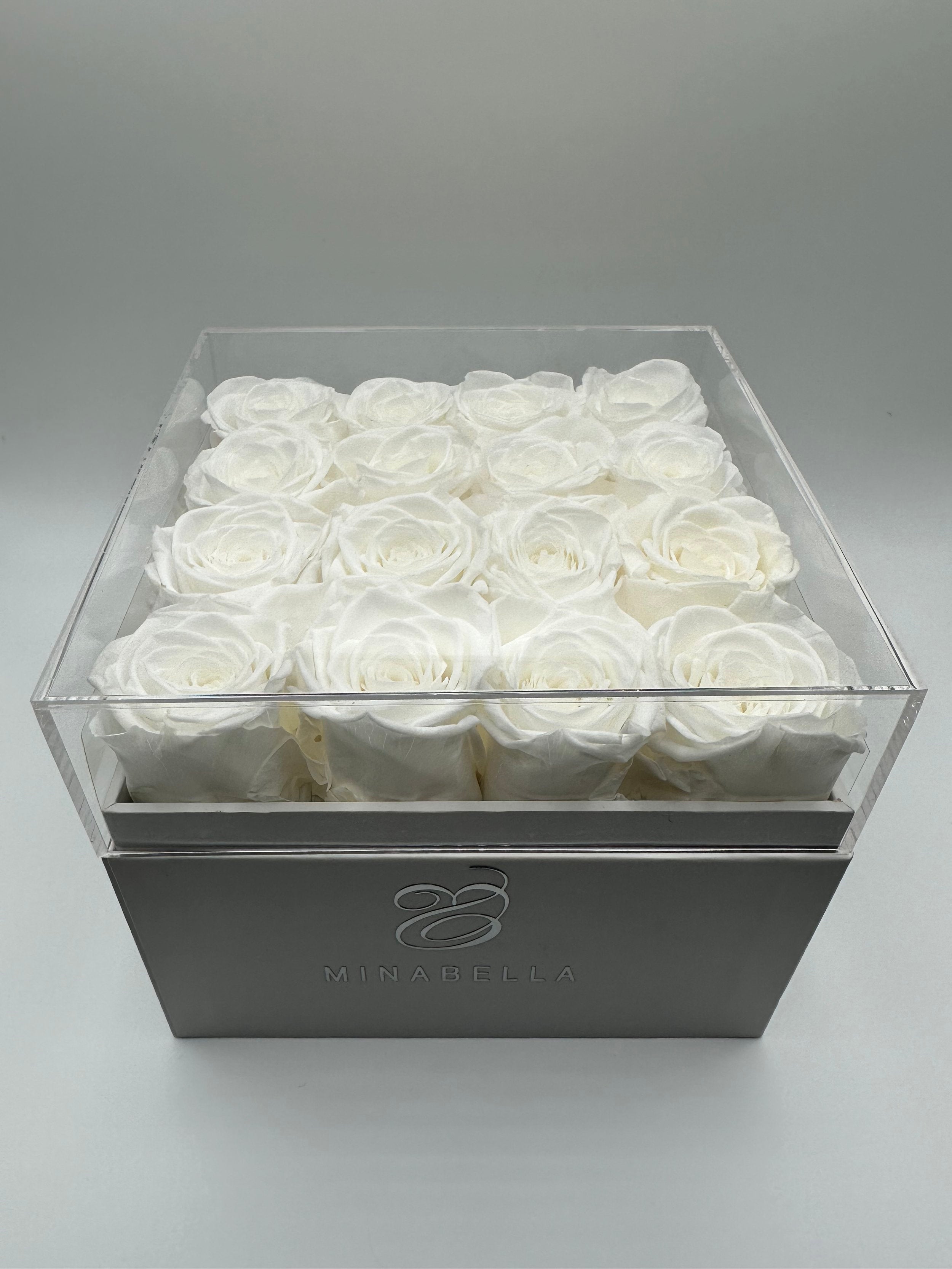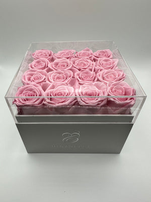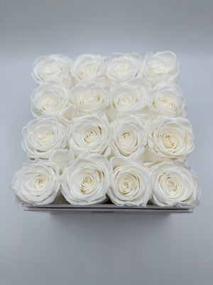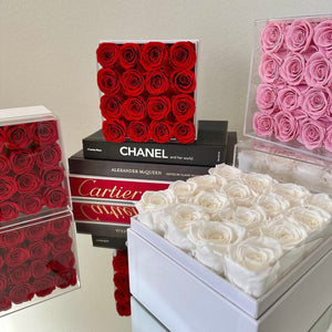 Long-lasting roses, elegantly encased within a pristine white square box featuring a sophisticated acrylic top cover. Choose from a captivating array of rose hues, including timeless white, romantic pink, and passionate red.
