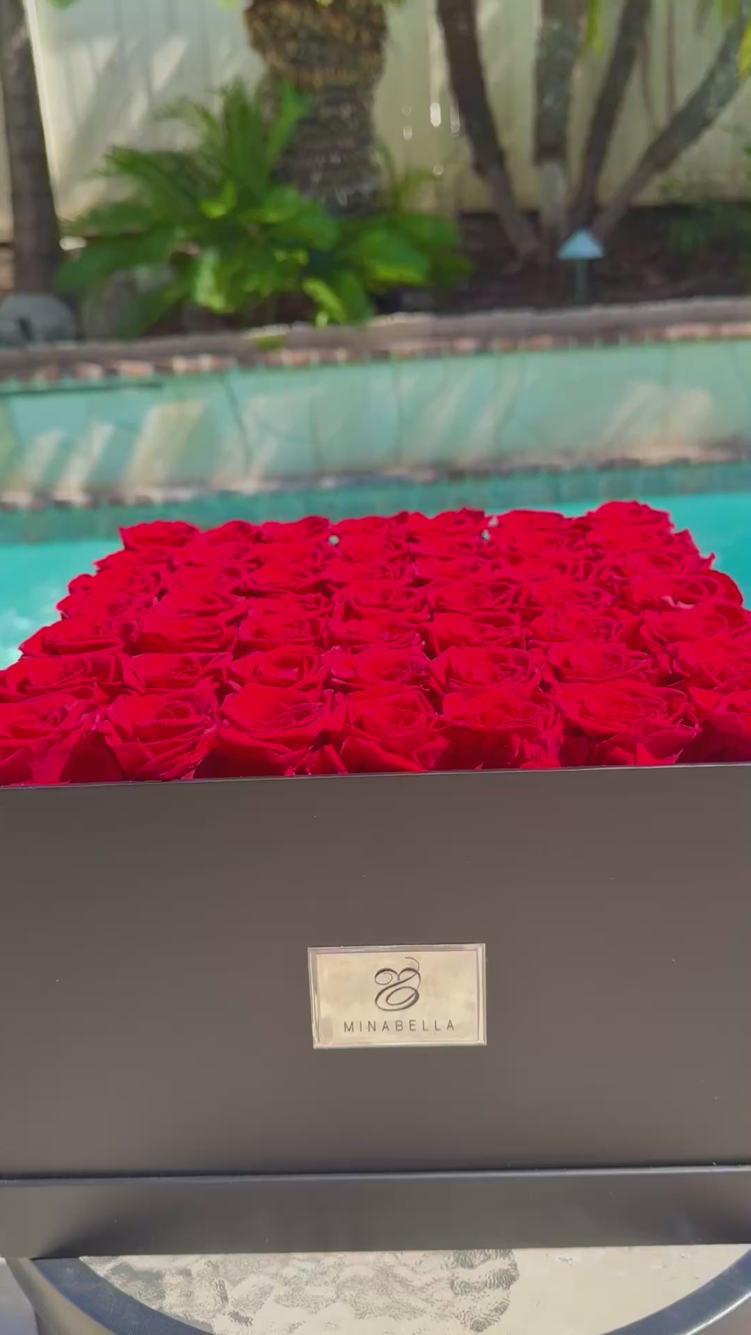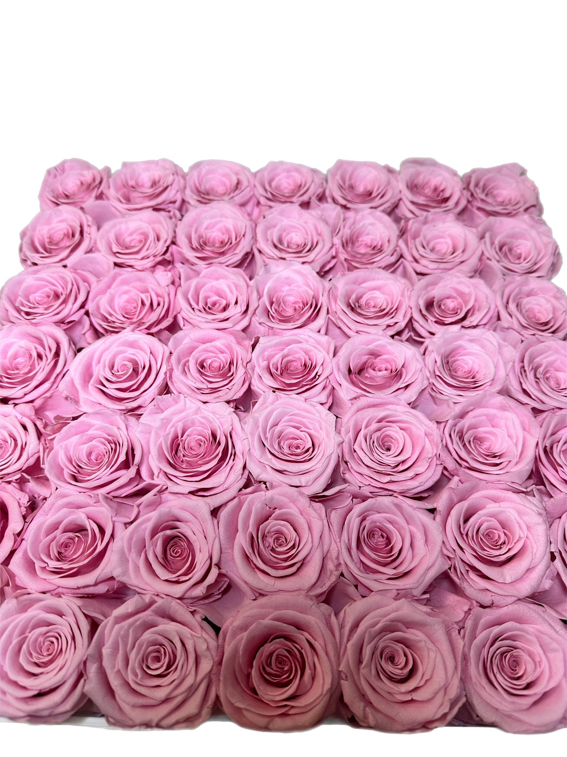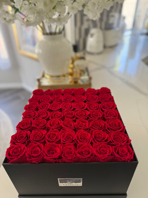 Within our exquisite large square box, you'll discover an arrangement of 49 vibrant, freshly preserved roses. This display is nothing short of impressive, evoking a sense of romance and timelessness that captivates the heart.