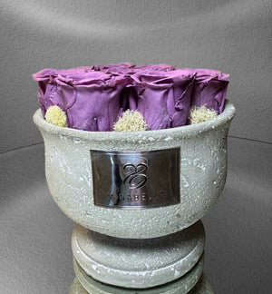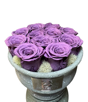 Elevate your space with a stunning display of 11 exquisite preserved lavender roses, elegantly arranged within a graceful footed pot. This timeless arrangement is designed to grace your surroundings for an impressive span of over 3 years.