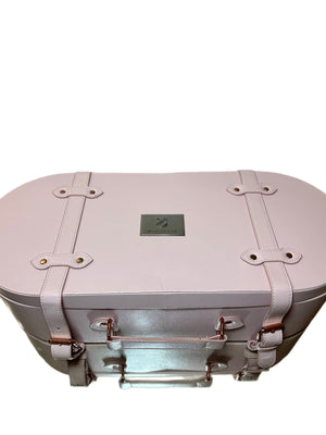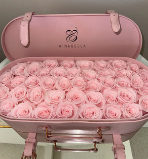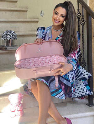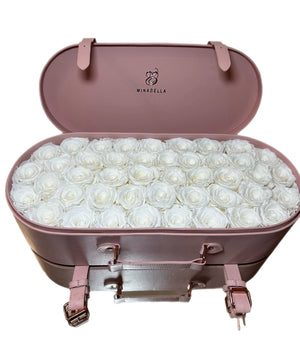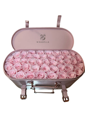 A symphony of blossoms nestled in a chic pink suitcase, ready to embark on your journey.