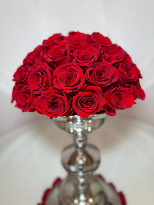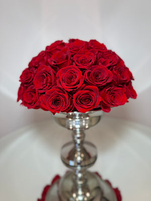 Introducing our stunning arrangement of 45 vibrant red roses beautifully displayed in a sleek silver footed vase. This elegant masterpiece is the perfect gift for any occasion—whether you’re celebrating someone special, brightening up any room in your home, or treating yourself to timeless luxury.