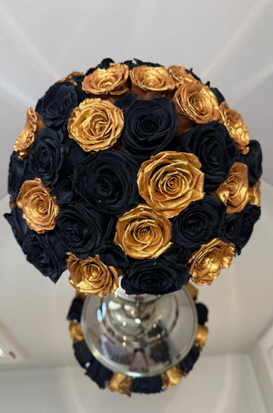53 preserved roses in bold shades of matte black and radiant gold, artfully set in a sleek silver vase. This luxurious design embodies elegance, power, and sophistication—perfect for statement decor, a bold romantic gesture, or an unforgettable gift.