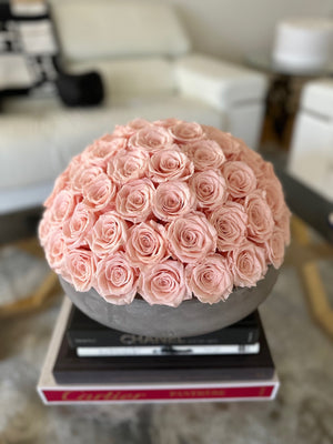 Experience the timeless beauty of 60 delicate baby pink eternal roses, lovingly arranged within an exquisitely handcrafted, elegant gray bowl. These are not just any roses; they are real roses that possess the remarkable ability to stay vibrant and fresh for over three years, requiring no maintenace whatsover.