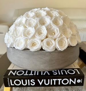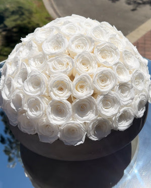 Elevate your space with 72 prisitine, eternal white roses thoughtfully arranged within a meticulously handcrafted, sophisticated gray bowl. These genuine roses boast a remarkable lifespan of over 3 years, requiring no upkeep.