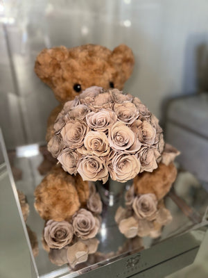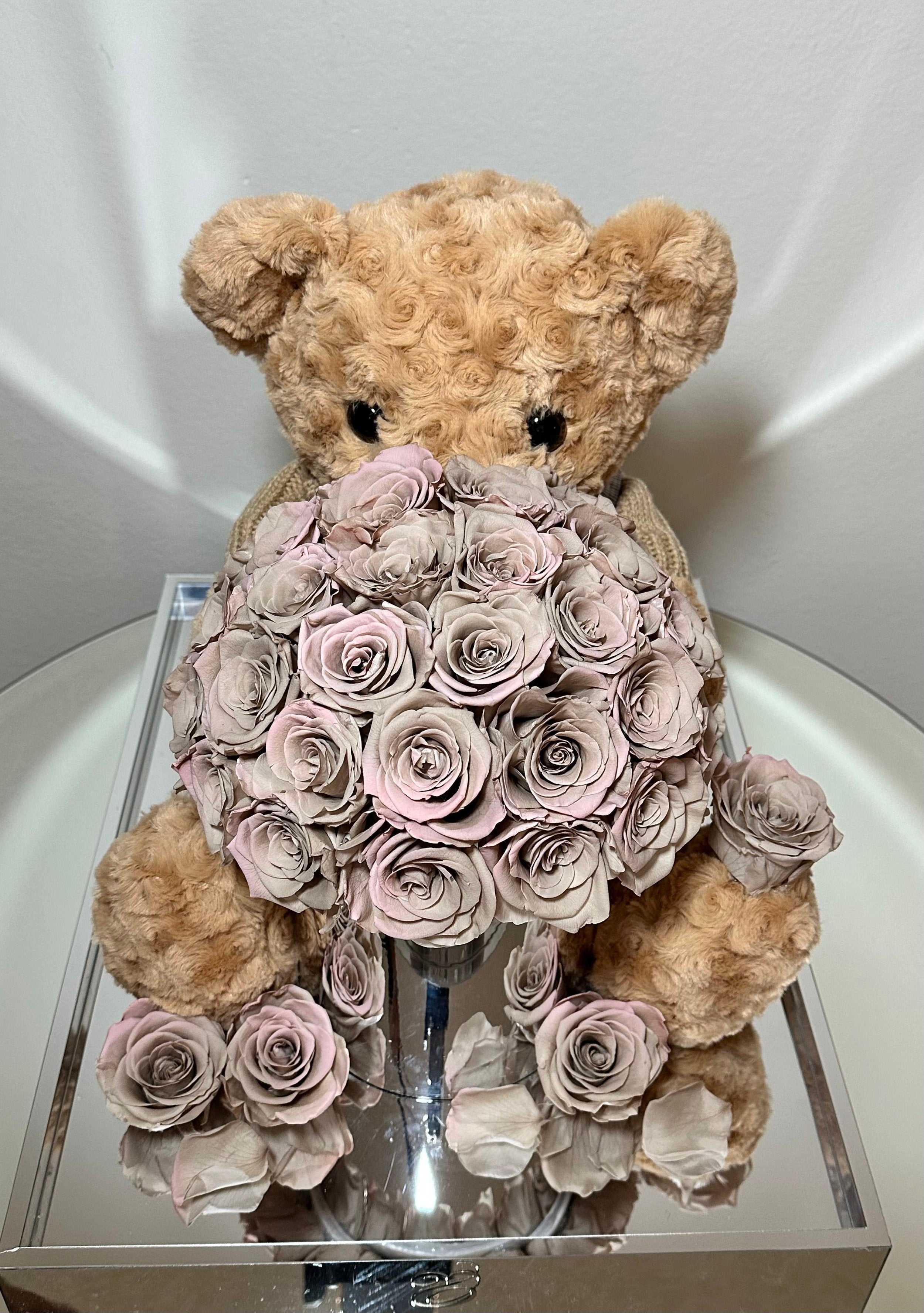 Embrace the eternal beauty of our Large plush teddy bear, cradling a bouquet of preserved roses. Elegantly presented in a sleek acrylic box with a mirrored base.