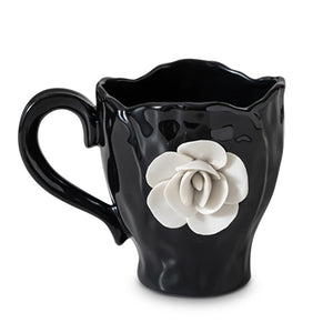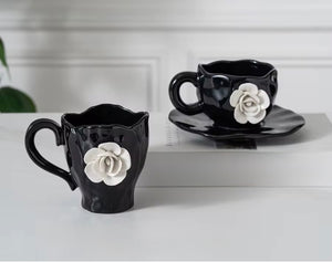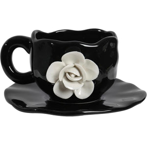 Elevate your tea or espresso moments with the Luxe Cups. Handcrafted in glossy black ceramic and finished with a sculpted ivory rose, this duo embodies refinement and romance. The flowing saucer design adds a touch of artistry, making it a centerpiece for any table setting or a thoughtful luxury gift.